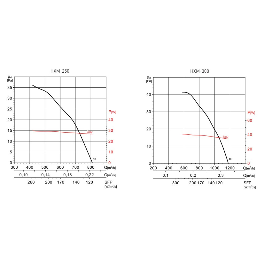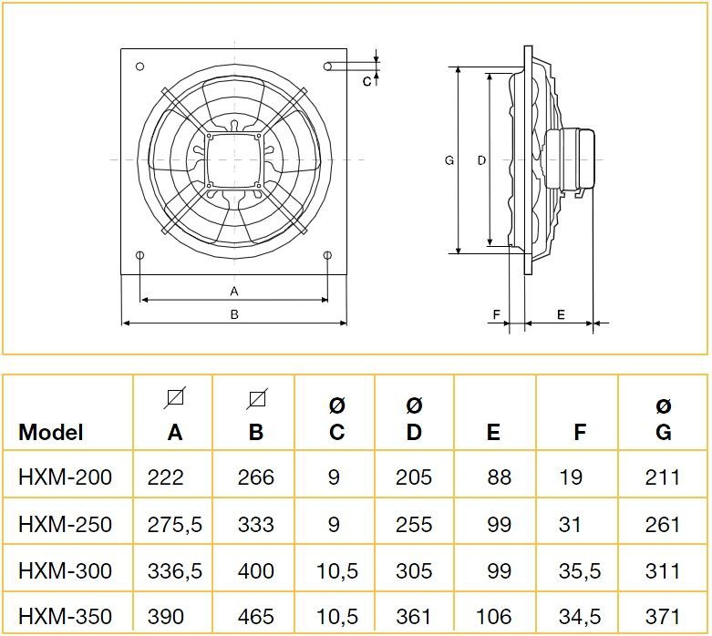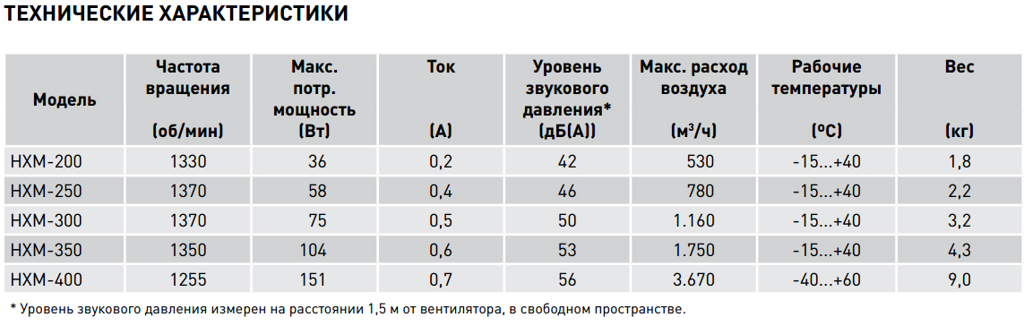 Модели от HXM-200 до HXM-350: Класс защиты IP44, класс изоляции B, с шариковыми подшипниками, встроенной термозащитой. Вентиляторы оснащены кабелем подвода электропитания, длиной 50 см.