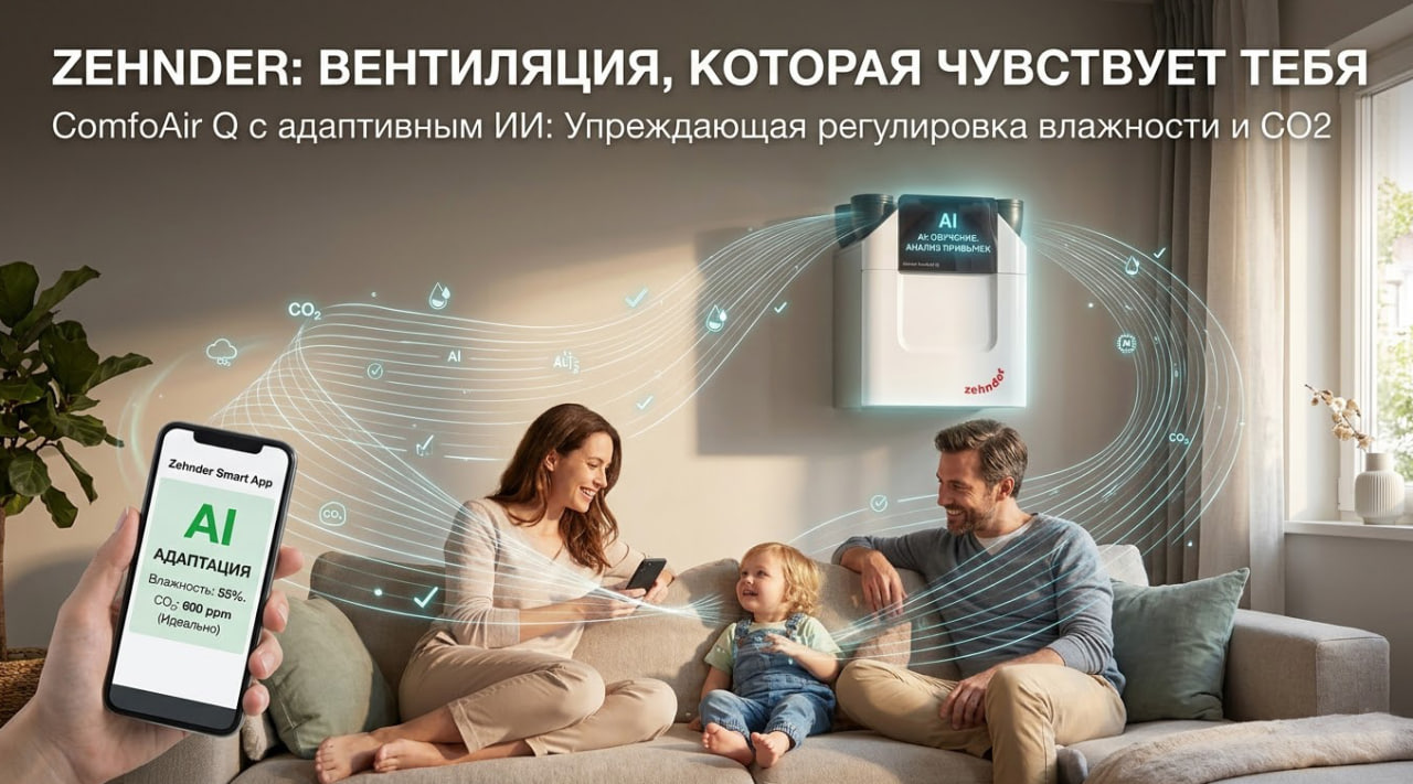 Zehnder: Вентиляция, которая чувствует тебя Бренд запустил систему ComfoAir Q с адаптивным ИИ, который анализирует привычки жильцов и регулирует влажность и CO2 еще до того, как показатели превысят норму.