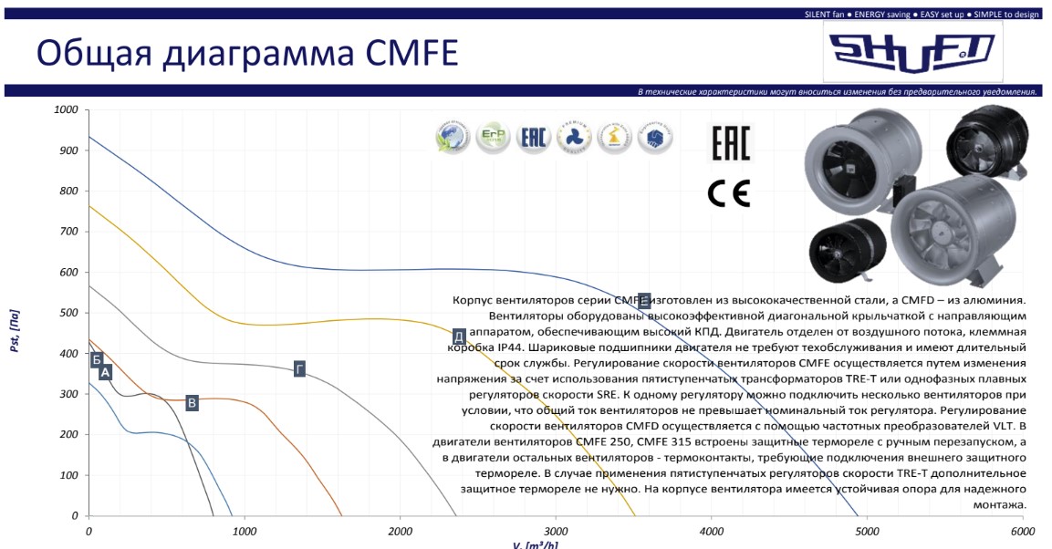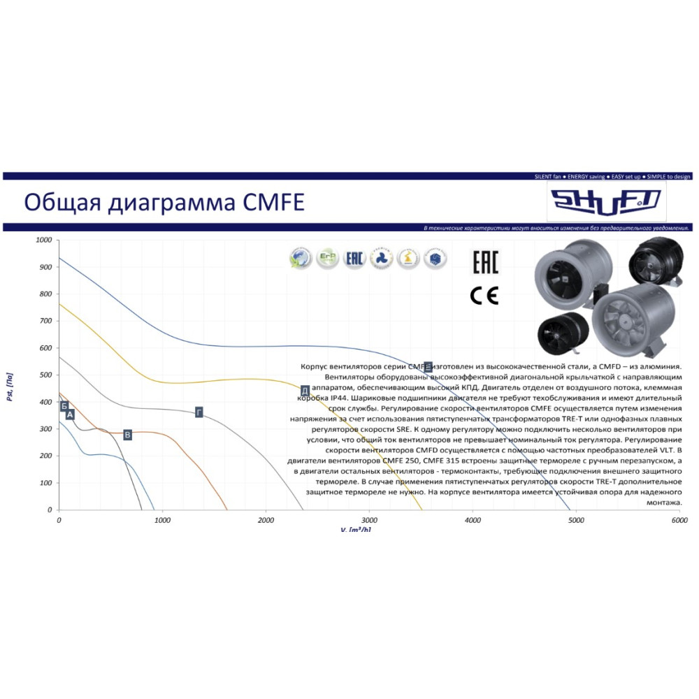 Корпус вентиляторов серии CMFE 355 изготовлен из высококачественной стали. Вентиляторы оборудованы высокоэффективной диагональной крыльчаткой с направляющим аппаратом, обеспечивающим высокий КПД. Двигатель отделен от воздушного потока, клеммная коробка IP44. Шариковые подшипники двигателя не требуют техобслуживания и имеют длительный срок службы. Регулирование скорости вентиляторов CMFE осуществляется путем изменения напряжения за счет использования пятиступенчатых трансформаторов TRE-T или однофазных плавных регуляторов скорости SRE. К одному регулятору можно подключить несколько вентиляторов при условии, что общий ток вентиляторов не превышает номинальный ток регулятора. Регулирование скорости вентиляторов CMFD осуществляется с помощью частотных преобразователей VLT. В двигатели вентиляторов CMFE 250, CMFE 315 встроены защитные термореле с ручным перезапуском, а в двигатели остальных вентиляторов - термоконтакты, требующие подключения внешнего защитного термореле. В случае применения пятиступенчатых регуляторов скорости TRE-T дополнительное защитное термореле не нужно. На корпусе вентилятора имеется устойчивая опора для надежного монтажа.