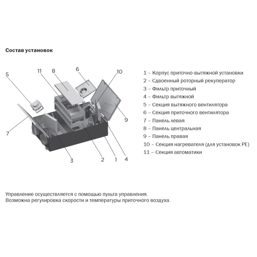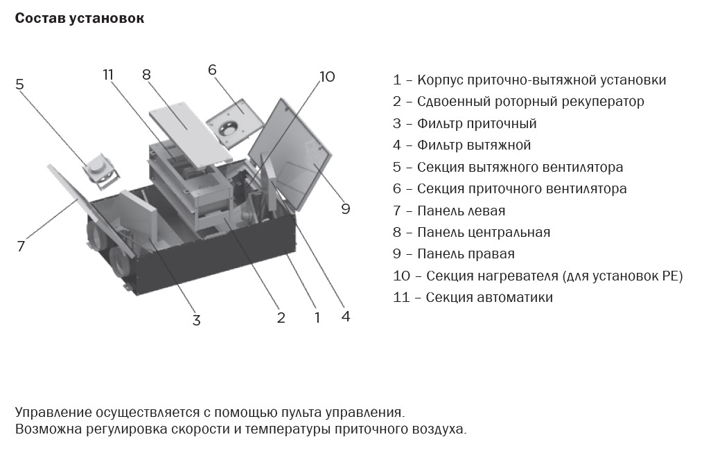 Очистка приточного воздуха происходит при помощи фильтра класса М5. Подогрев воздуха осуществляется при помощи электрического нагревателя. Для уменьшения энергопотребления используется высокоэффективный роторный рекуператор с эффективностью до 75%. В процессе работы вытяжной воздух, удаляемый из помещения, очищается и поступает на роторный рекуператор, при помощи которого из вытяжного воздуха извлекается тепло и передается приточному воздуху.